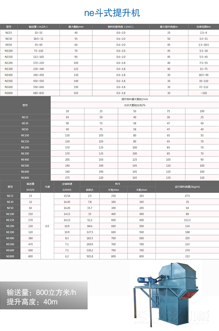ne斗式提升机采用自流式装料,重力式卸料,提升范围广,不仅能提升一般粉状、粒状和块状物料,而且可提升磨琢性大的物料,物料温度≤250度。链条是优质合金钢高强度板式链条,耐磨可靠,驱动部分采用硬齿面减速机,运行平稳,输送量:800m³/h