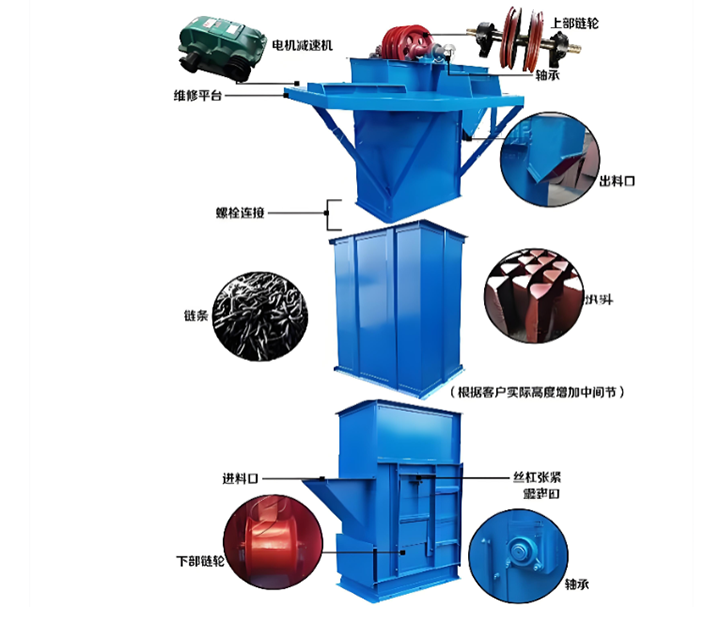 TD160皮带斗式提升机的机身中部为标准节段,可根据实际安装空间灵活调整高度;进料口可根据物料特性设计为掏取式或流入式,确保喂料顺畅。
