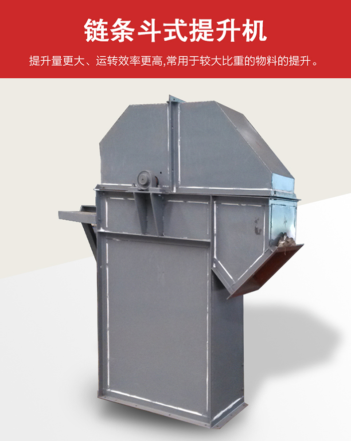 链条式斗式提升机是一种常用的提升机设备,TH型链条式斗式提升机采用锻造环链作为传动部分,具有很强的机械强度,链条式斗式提升机主要用于提升粉体和小颗粒及小块状物料,区别于TD型斗式提升机,链条式斗式提升机提升量更大、运转效率更高。链条式斗式提升机常用于较大比重的物料的提升。